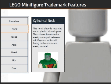 I envisioned the background image panning and zooming to highlight different parts of the minifigure while dialog boxes appeared in the foreground with descriptive text. I quickly found that Articulate was not designed for this kind of image animation. I wanted the animation to respond correctly when the user clicked any of 7 tabs, in any sequence.